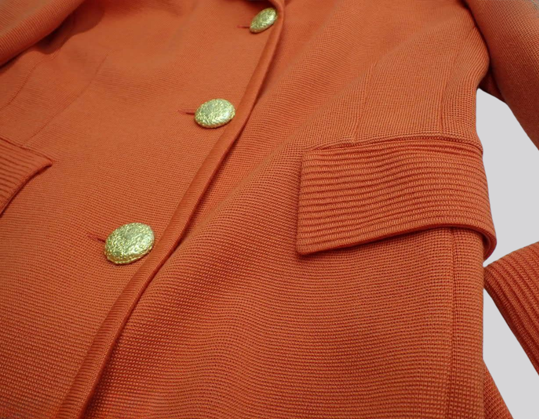 A structured coral wool cardigan from Yves Saint Laurent that feels halfway between knitwear and a blazer. The vivid colour and refined details make it a standout layer for the Midnight capsule, adding warmth and presence to dresses, tailored trousers or even simple jeans and a tee.